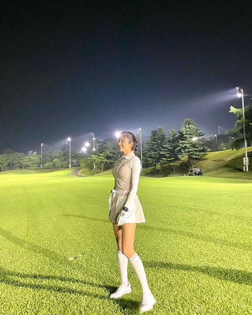 公開された写真には、ライトに照らされた夜のゴルフ場で、タイト目なウェアを着てグリーンの上に立つジョン・ジユの姿が写っている。
