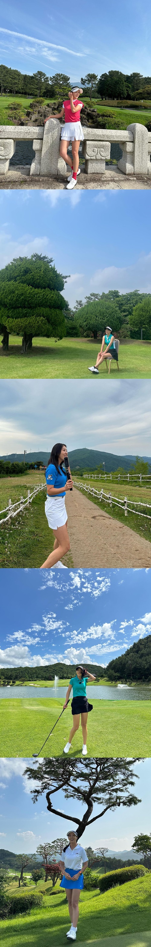 投稿を見ると、各地のゴルフ場でそれぞれ異なるゴルフウェアを着用し、モデルさながらにポーズを取るユン・チェヨンの姿が写っている。