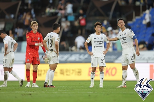 (写真提供=韓国プロサッカー連盟)光州戦で敗れ、肩を落とす蔚山の選手たち