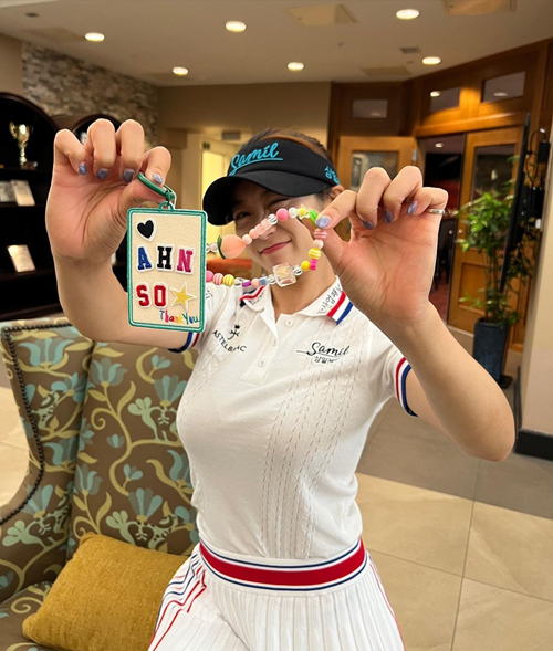 写真を見ると、自身の名前を縮めた「AHNSO」と書かれたネームタグを手に、カメラに向かってキュートにウィンクをするアン・ソヒョンが写っている。どうやら、ネームタグはプロゴルファー仲間のホン・ジュヨンがハンドメイドで作成したもののようだ。