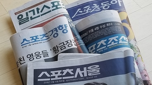 韓国には現在、1969年発刊の『日刊(イルガン)スポーツ』、1985年発刊の『スポーツソウル』、1990年発刊の『スポーツ朝鮮(チョソン)』、2004年発刊の『スポーツ京郷(キョンヒャン)』、2005年発刊の『スポーツワールド』、2008年発刊の『スポーツ東亜(トンア)』、2015年発刊の『韓国スポーツ経済』など、7つのスポーツ新聞がある。