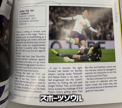 トッテナムはプログラム内で「Goals of the Decade(10年間のベストゴール)」というタイトルで、過去10年間に生まれたベストゴールを紹介した。そのなかには、今年12月8日に行われ、5-0で大勝したバーンリー戦で、ソン・フンミンが約70mを独走して決めたスーパーゴールも含まれていた。
