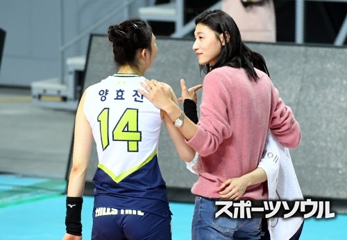Vリーグの試合に訪れ、後輩たちと挨拶を交わすキム・ヨンギョン