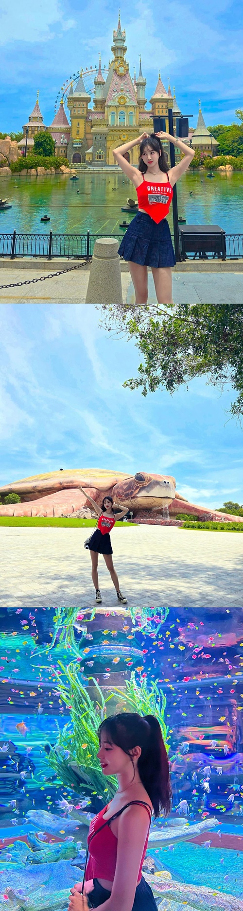 キム・ハンナは赤色のクロップドキャミソールにデニム柄のミニスカートを合わせたコーディネートで、パーク内の各所でポーズを披露。薄着姿から伝わるスラリとしたスタイルの良さで、見た者の多くを虜にしていた。