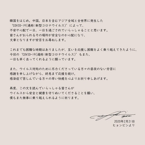 手紙を通じてヒョンビンは、「これまでも困難な時期はありましたが、互いを応援し困難をよく乗り越えてきたように、今回の“COVID-19(通称:新型コロナウイルス)”もまた、一日も早く去ってくれるように願っています」と伝えた。