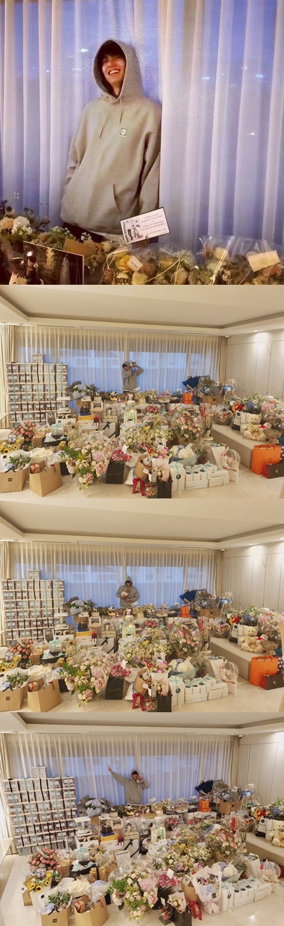 「何気ない今日1日を特別にしてくれた皆さんに感謝します」という文章を添えた写真には、花束やプレゼントで埋め尽くされたリビングに立つイ・ミンホの姿が写っている。