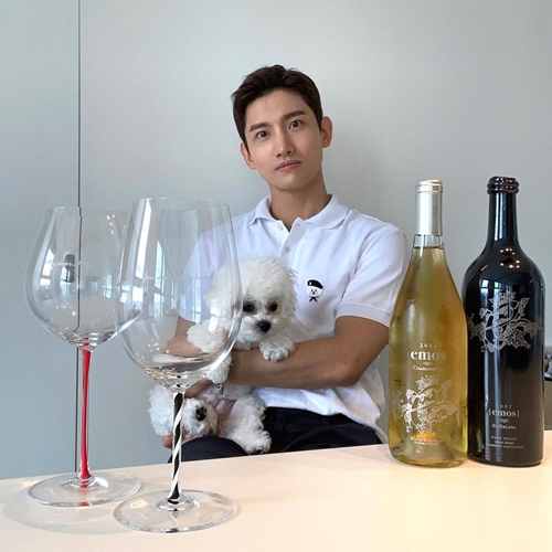 愛犬を抱えてまっすぐにカメラを見つめるチャンミン。目の前には、ワインと共に個性的な模様のワイングラスが置かれている。