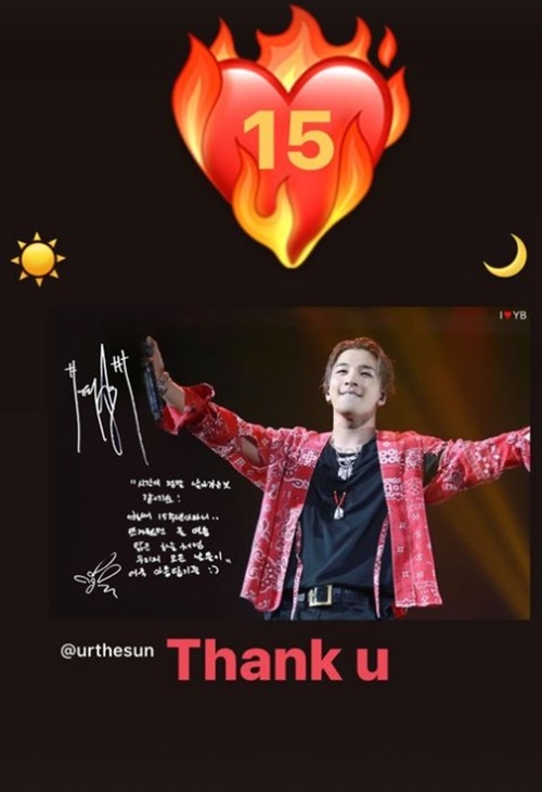 SOLは自身のインスタグラムのストーリー機能を通じて「時間が本当に飛んでいくようですね。もう15周年だなんて。暑かった今年の夏、澄んだ空のように私たちのすべての日々がもっと美しくありますように」と直筆のメッセージが書かれた写真を公開した。