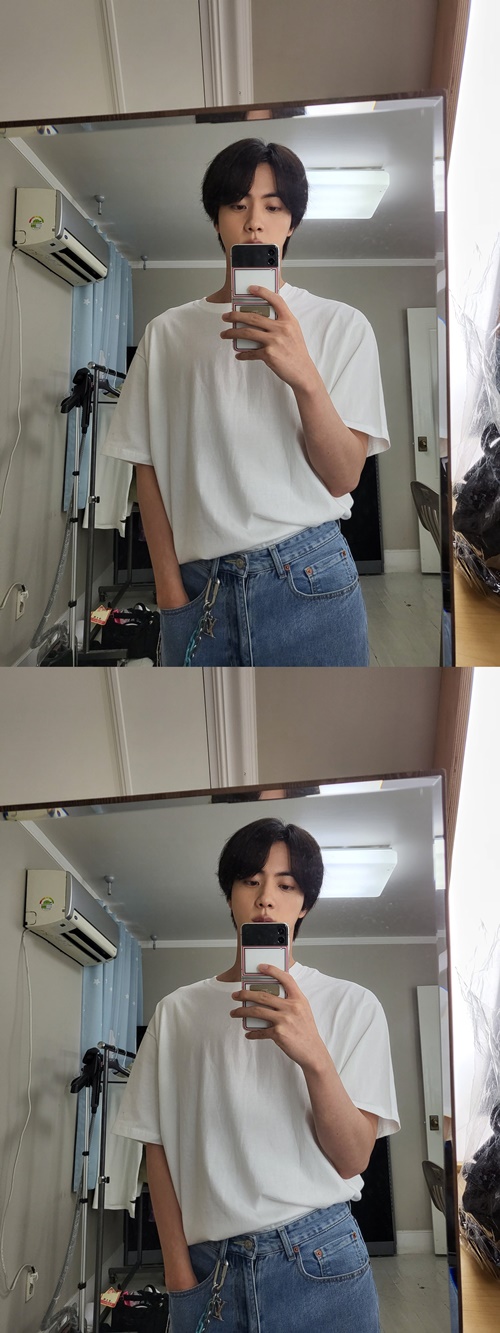 BTS公式ツイッターは8月29日、2枚の写真を投稿。公開された写真には、スタンドミラーで自撮りをするJINが写っている。