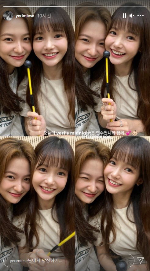 Red Velvetイェリが9月22日、インスタグラムのストーリーを更新。「今日のyeri’s midnightはヨンス姉さんと一緒に」という文章を添え、女優ハ・ヨンスとのツーショットを公開した。