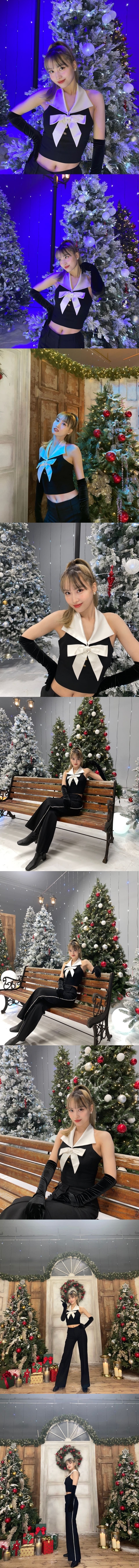 写真にはツリーの前でポーズを決めるモモの姿が。大きなリボンのついたトップスにロングパンツで、ウエストがあらわになった“へそチラSHOT”となっている。