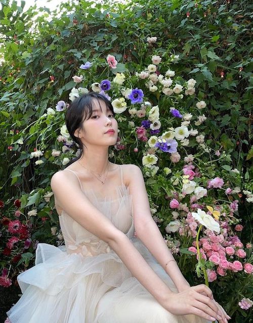 写真の中のIUは、花のやぶ前でポーズをとっている。特有の白肌と細すぎる腕、デコルテなどが“妖精”のような雰囲気を醸し出すと同時に、アゴを上げてカメラを見つめた顔が目を引いた。