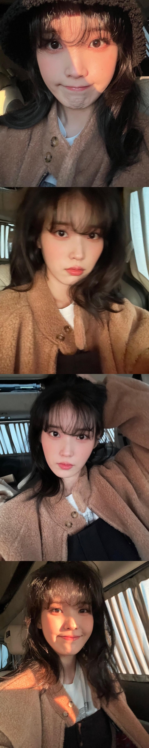 車内で撮影したと見られる自撮り写真には、こちらを見つめるIUが。大きな目をぱっちりと開きながら唇を結ぶ姿が、なんとも愛らしい印象を与えた。