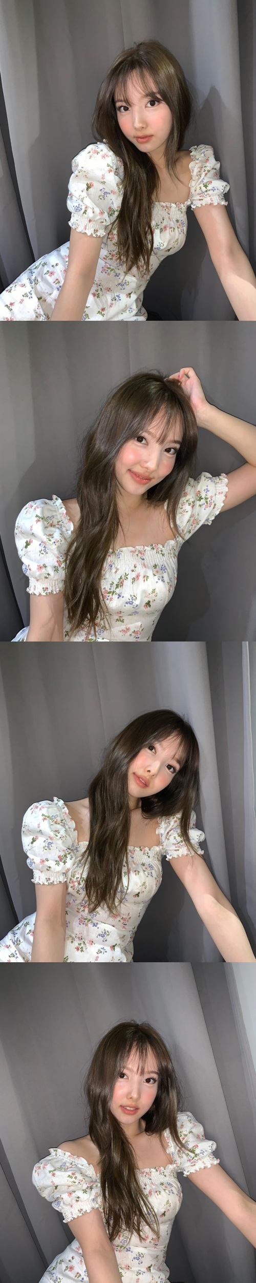 花柄のワンピースを着用したナヨンは、前髪をシースルーバングに、後ろ髪は下ろしたフェミニンなスタイルを披露している。