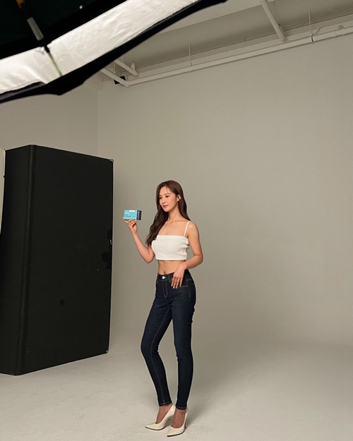 公開された写真のユリは、自らがモデルを務める製品の撮影をしている。短めのクロップドTシャツとインディゴデニムのシンプルな装いが、ユリの美貌を際立たせている。