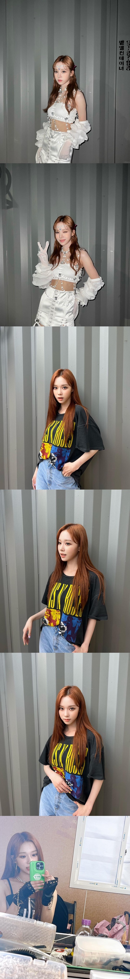 投稿を見ると、華やかな装飾で彩られたステージ衣装の姿やラフなオーバーサイズTシャツ姿などでポーズをとるWINTERが写っている。最後の写真では楽屋と思しき場所での鏡越しの自撮りを披露し、キュートな指ハートでファンを虜にした。