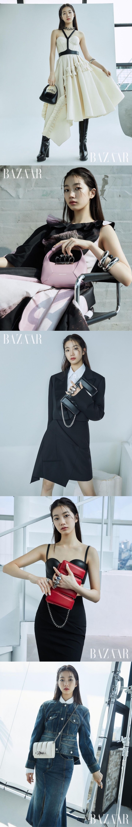 白シャツにジャケット、アシンメトリーなデザインのスカートでシックな雰囲気を纏ったかと思えば、別のカットでは一変。レザー調のドレスという“辛口コーデ”を堂々と着こなしている。