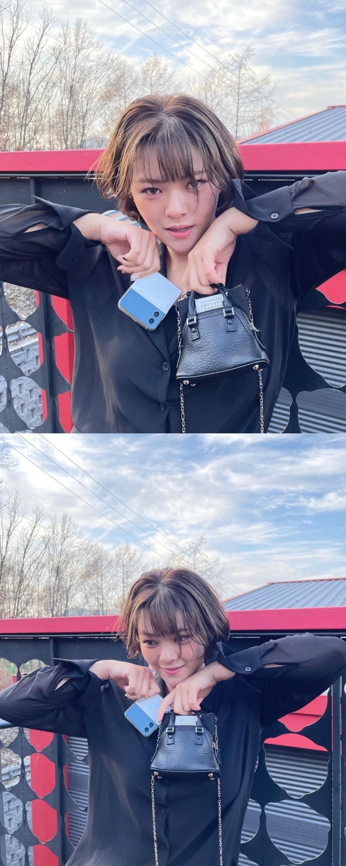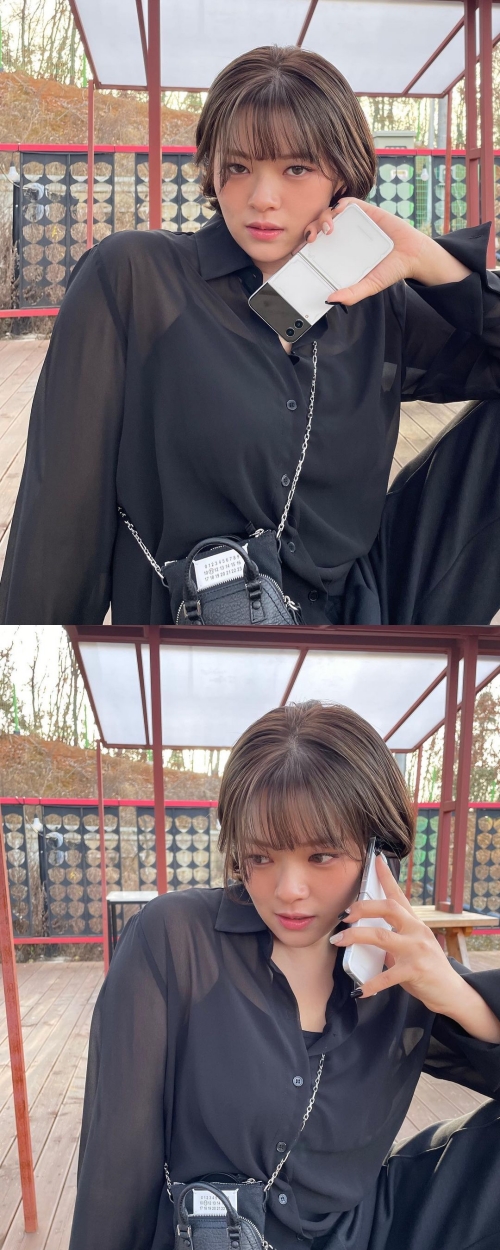 細身パンツに、シースルーシャツ、全身黒でまとめたスタイリッシュなコーデが、ジョンヨンの切り揃えられたショートボブヘアによくマッチしている。