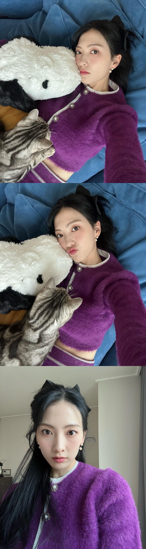 紫のセットアップに大きめのリボンを付けたジヨン。何よりもトップスが少し上がり、ボトムスとの隙間から見える薄いウエストが目を引く。