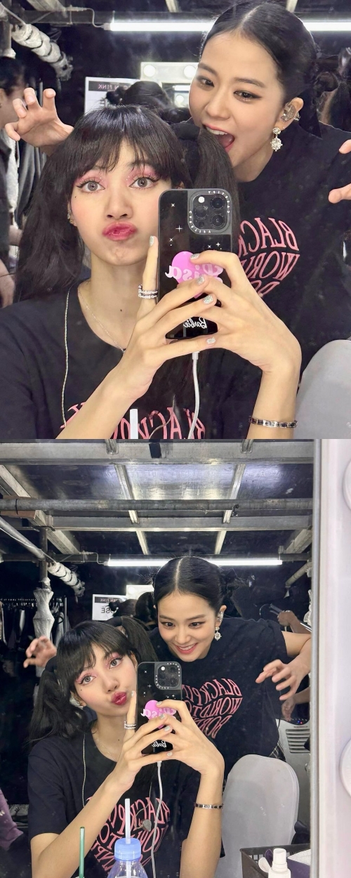 リサは鏡の前でスマホを向けながら口をすぼめたチャーミングな表情を浮かべており、その後ろではジスが口を大きく開けながら脅かすようなポーズを取っている。