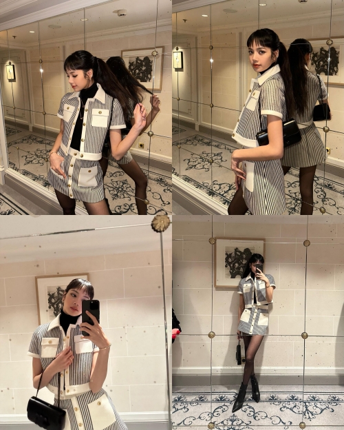 リサは黒のニットにストライプ柄のセットアップというスタイリッシュな装い。ストッキングがほっそりした美脚をさらに際立たせている。