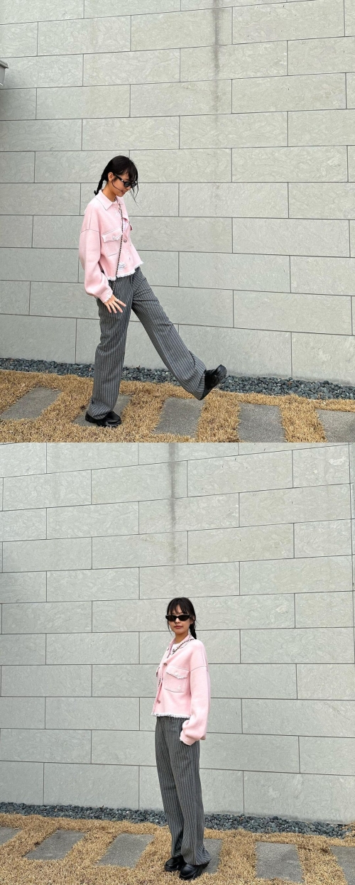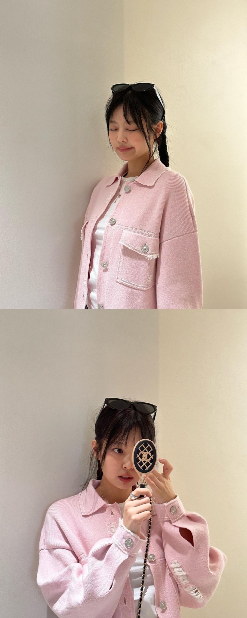 ジェニーは、オーバーサイズのグレーのパンツにピンクのジャケットを羽織った“桜コーデ”。手鏡をのぞく仕草も愛らしい印象を与えている。