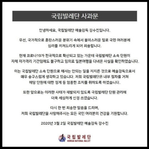 今回の騒動を受けて、韓国国立バレエ団側は3月2日に公式文書を通じて謝罪した。