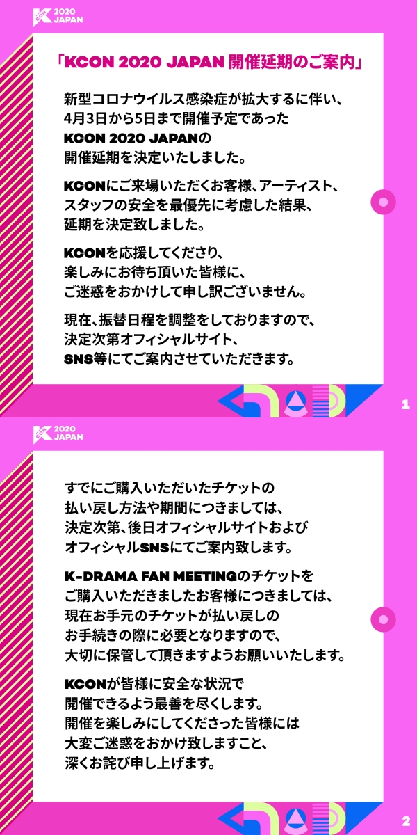 4月3~5日まで千葉幕張メッセ国際展示場で開催予定だったCJ ENM主催の「KCON 2020 JAPAN」も、延期を発表している。