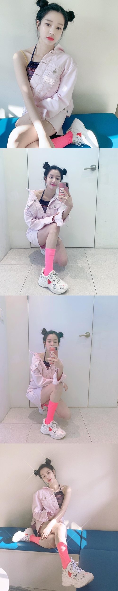 イ・ユビは3月26日、インスタグラムに鏡越しの自撮り写真を数枚投稿。ポップな服装とヘアスタイルで目を引いた。