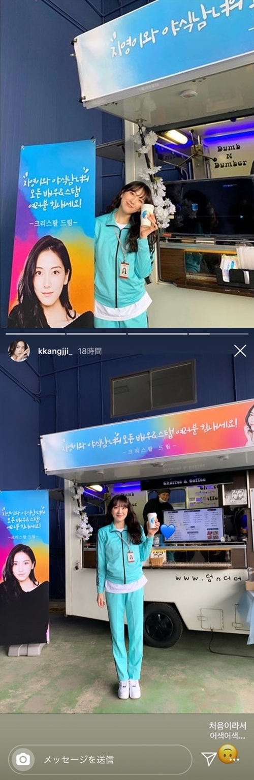 知英は3月25日、インスタグラムに1枚の近況写真を投稿。「『夜食男女』、たくさん期待していてくださいー! スジョンイの贈ってくれたコーヒーカー、本当にありがとう♡」と綴り、クリスタルに感謝を伝えた。