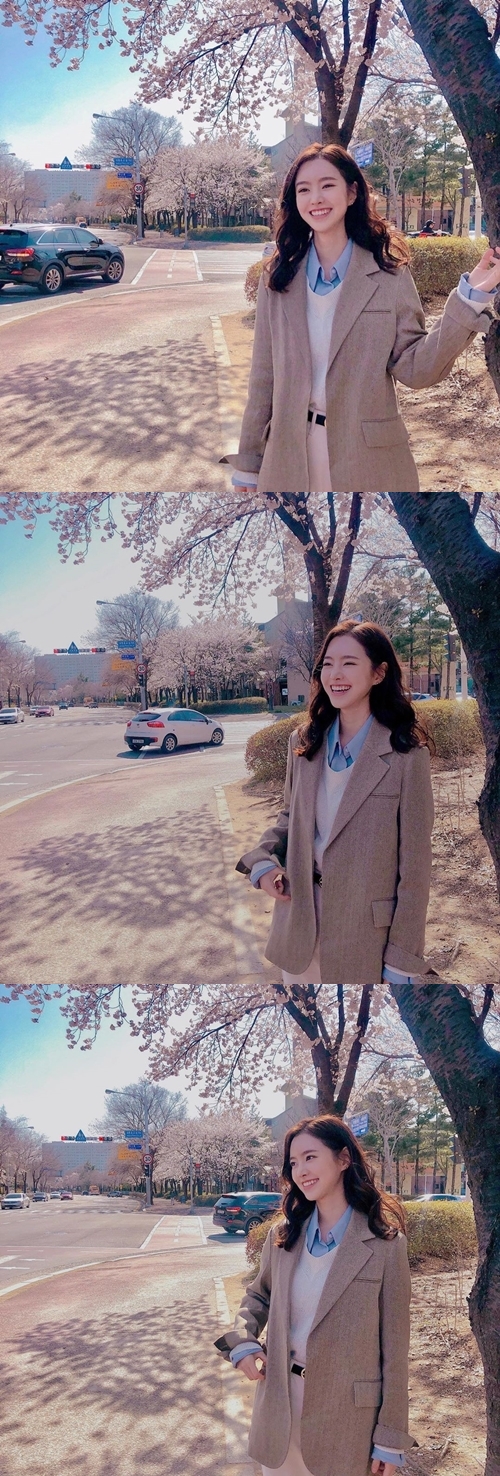 写真の中のチン・セヨンは、暖かい日差しを受けて笑顔を見せている。満開の桜の花と、風になびく髪の毛が春らしさを感じさせる。
