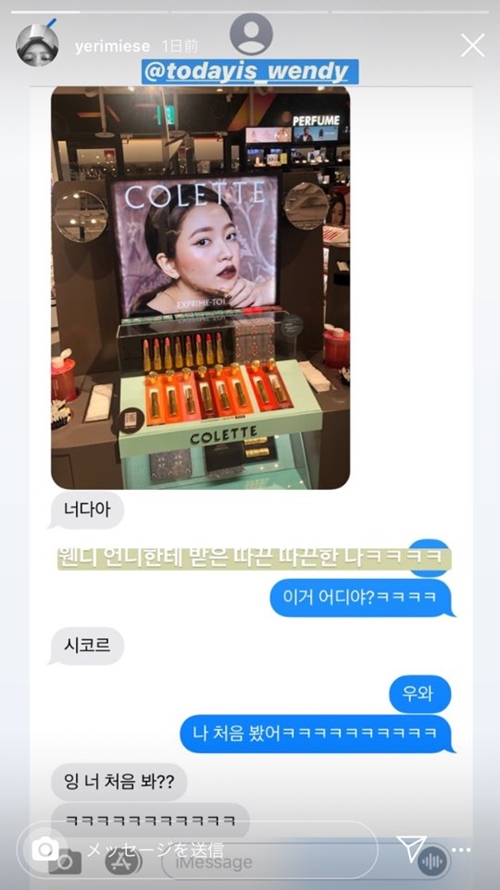 メッセージ内容によると、ウェンディはあるショッピングモールでイェリがモデルを務めたコスメブランドを発見したようだ。イェリの写真と共に「あなただ」と送り、イェリもまたこれに対して「どこで見つけたの? 」「私は初めて見たよ(笑) 」と新鮮な反応を示した。