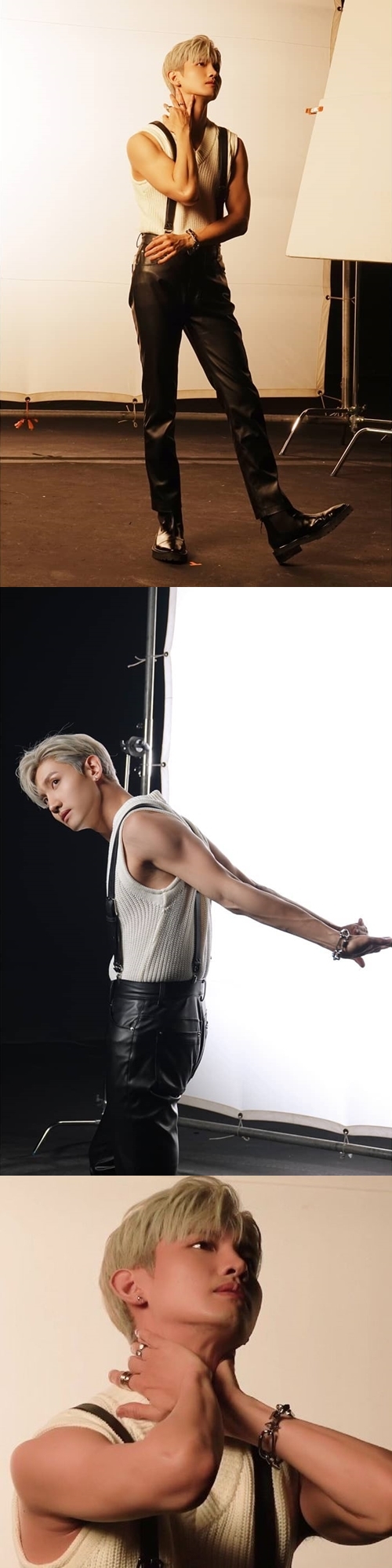 写真の中のチャンミンは、タイトな衣装に身を包み強い眼差しでカメラに向かっている。しなやかなシルエットとのギャップを感じさせる逞しい腕や、スラリと伸びた脚が印象的だ。