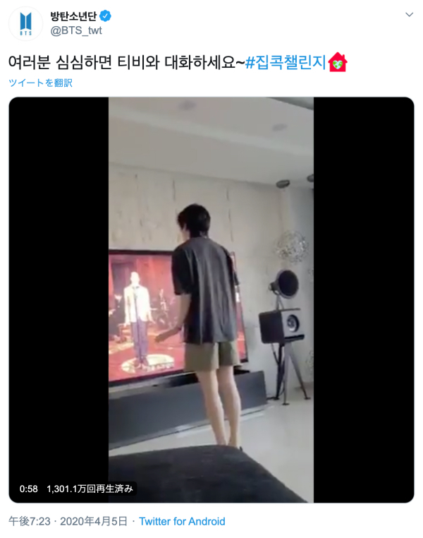 そんななか、BTS(防弾少年団)のメンバー、Vは公式SNSに「皆さん、暇ならTVと会話しましょう」と、楽な服装をしてテレビで流れるザ・チェインスモーカーズの「Closer」に合わせて踊る動画を投稿し、「引きこもりチャレンジ」に参加した。