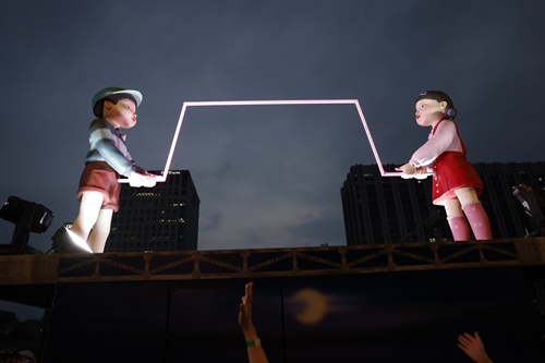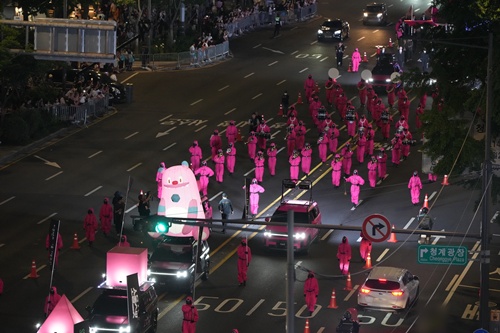 パレードには、シーズン3の新ゲーム「大縄跳び」で再登場する巨大ヨンヒ人形が現れ、さらに「だるまさんがころんだ」を再現。街中には大勢のピンクガードが溢れ、ソウル全体が一夜にして「イカゲーム」ワールドへと変貌した。