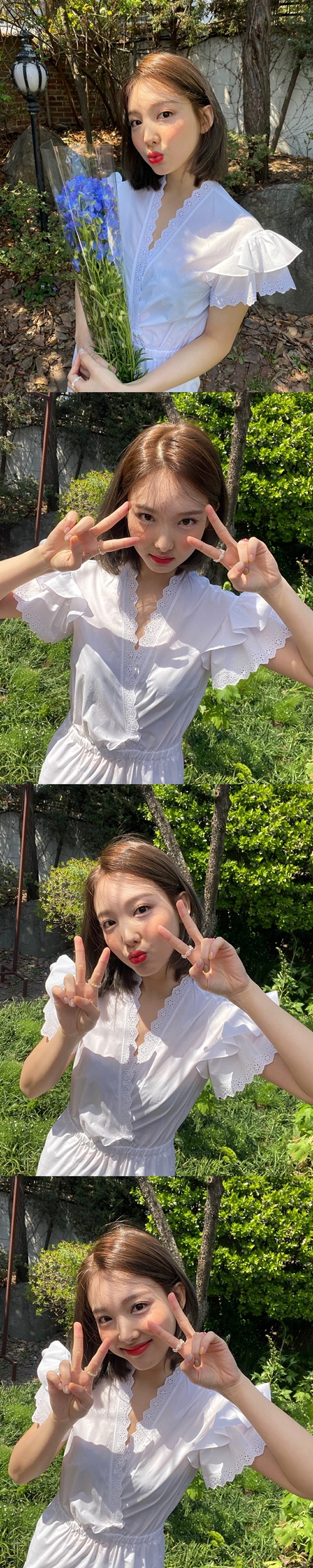 写真の中のナヨンは、真っ白なワンピースに身を包み多彩な表情を見せている。肩のラインで切りそろえられたボブヘアはナヨン特有の透明感を際立たせ、可憐な印象を与える。