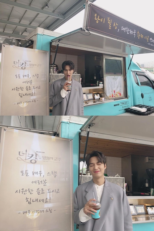 写真の中のイ・ミンホは、俳優イ・ジョンジェから撮影現場に贈られたコーヒートラックの前で明るい笑顔を浮かべている。作品で共演することはなかったが、2人は普段から親交が深いことで知られている。