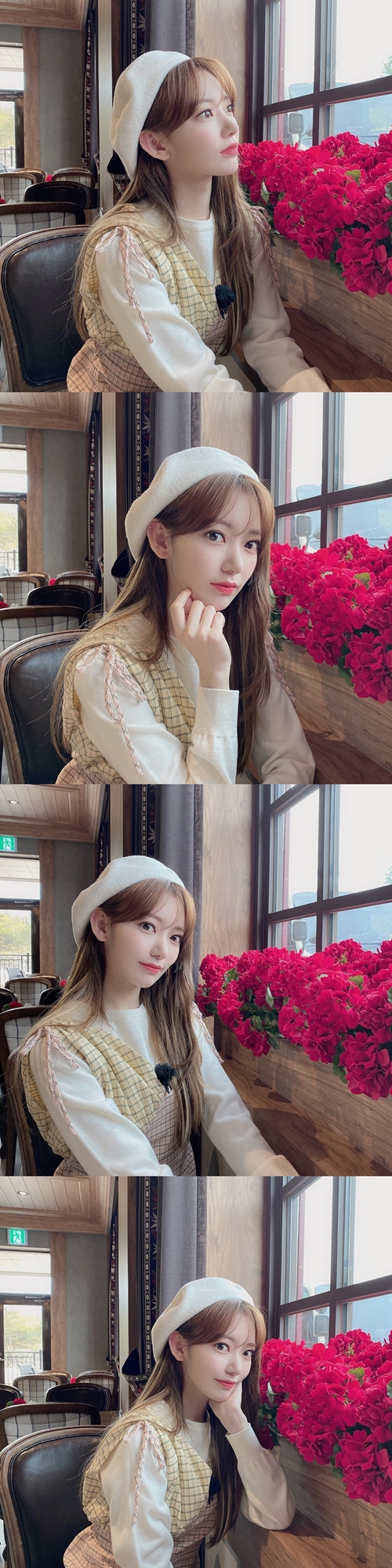 写真の中の宮脇咲良は、パステルカラーで統一されたコーディネートに身を包み、ベレー帽を被っている。彼女ならではの透き通るような白い肌と、可憐なイメージが際立つ装いだ。