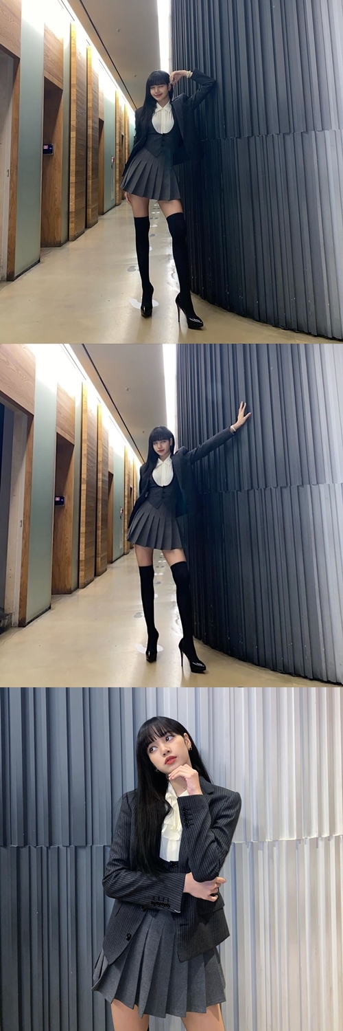 リサならではのスタイルの良さには、とくに注目が集まった。写真の中のリサは、ミニスカートとジャケットを合わせたモノトーンコーディネートを完成させ、赤リップを強調したメイクで格別なオーラを放っている。