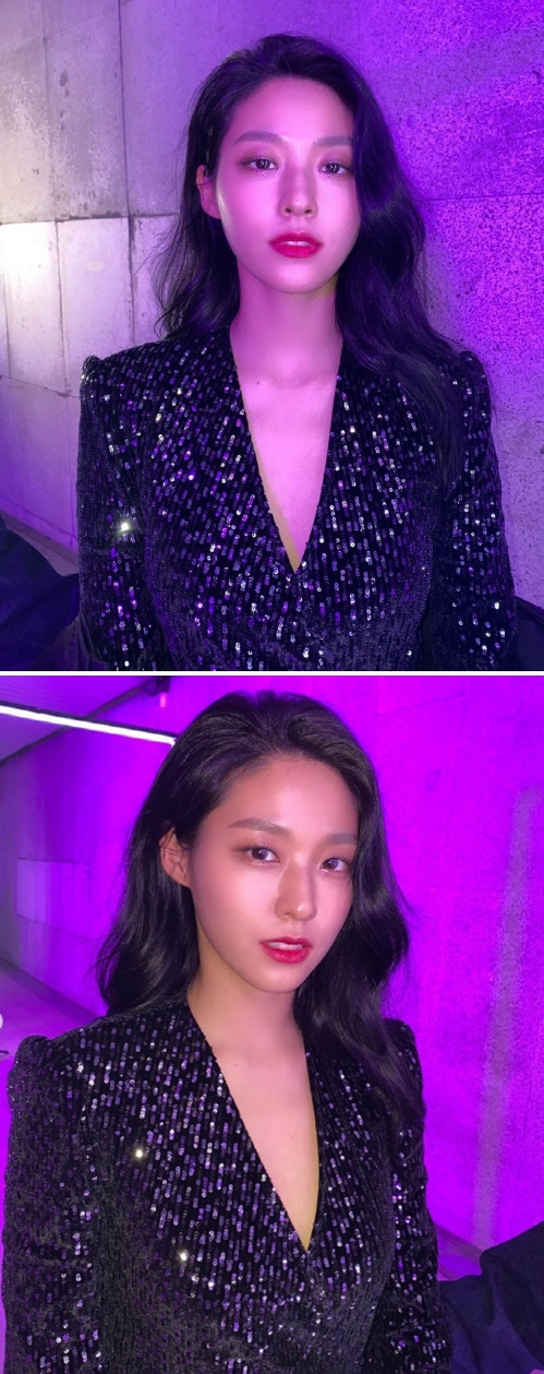 鱗のように輝くスパンコールドレスは、ソリョンの身体のラインに沿って反射し、神秘的な雰囲気を与えている。