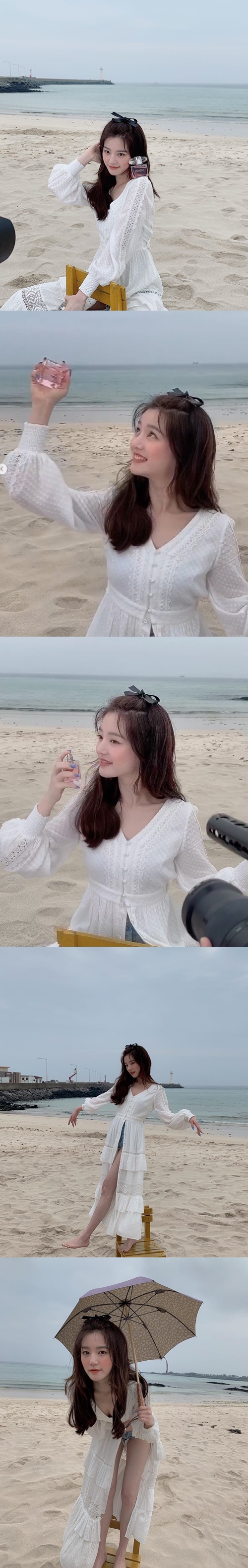 写真の中のイ・ユビは、ボタンの付いたレトロなロングワンピースにデニムショートパンツを合わせ、裸足で海辺を歩き回りながら可愛らしい魅力を発散した。