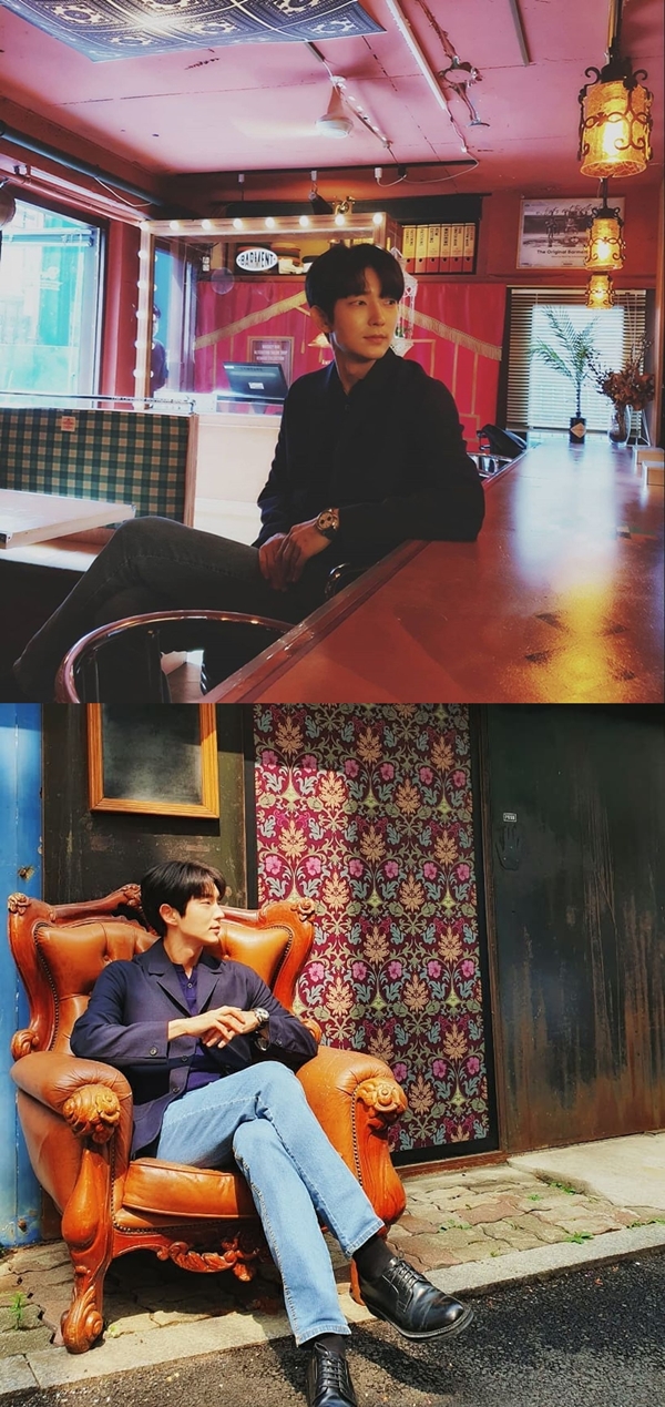 写真の中には、カウンターに腰を下ろしてどこかを見つめる姿と、ソファーに座って脚を組むイ・ジュンギの姿が写っている。