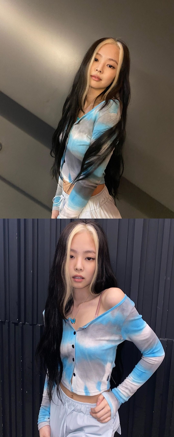 写真の中には、長い髪を下ろしてブルーのタイダイ柄のトップスを着用したジェニーが写っている。