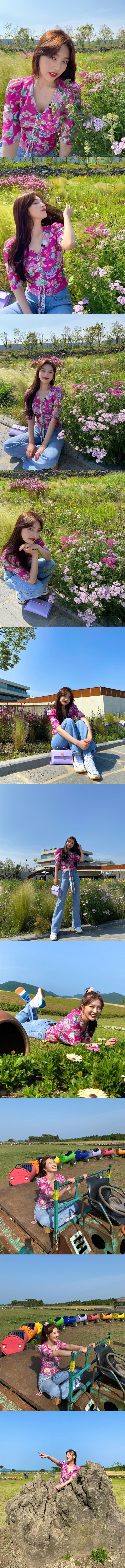 公開された写真には、済州島の雲一つない綺麗な青空をバックに花々と写真を撮るジョイの姿が写っている。