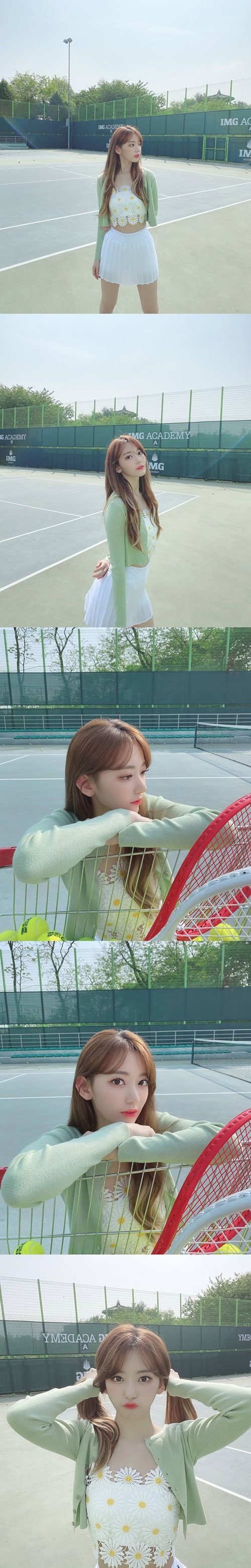 テニスコートで行われた今回の撮影で、宮脇咲良はフレッシュな魅力を存分に発散。マーガレットの型抜きトップスと、爽やかなグリーンのカーディガンで可愛らしく爽やかな仕上がりを実現した。