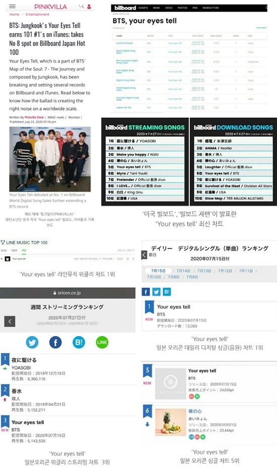 7月23日(現地時間)、海外メディア『PINKVILLA』が7月15日に日本で発売した4thフルアルバム『MAP OF THE SOUL:7~THE JOURNEY~』の収録曲でJUNG KOOKが作曲した『Your Eyes Tell』が「ビルボード」と「iTunes」で様々な記録を塗り替え、新たに樹立していると報道した。