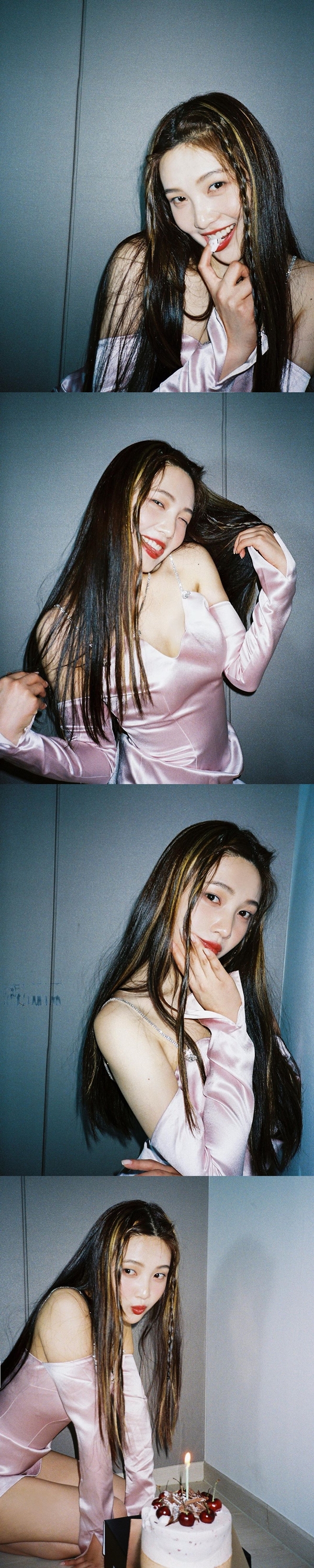写真にはピンクのミニドレスを着用し、ケーキのそばで楽しげにポーズをとるジョイの姿が写っている。