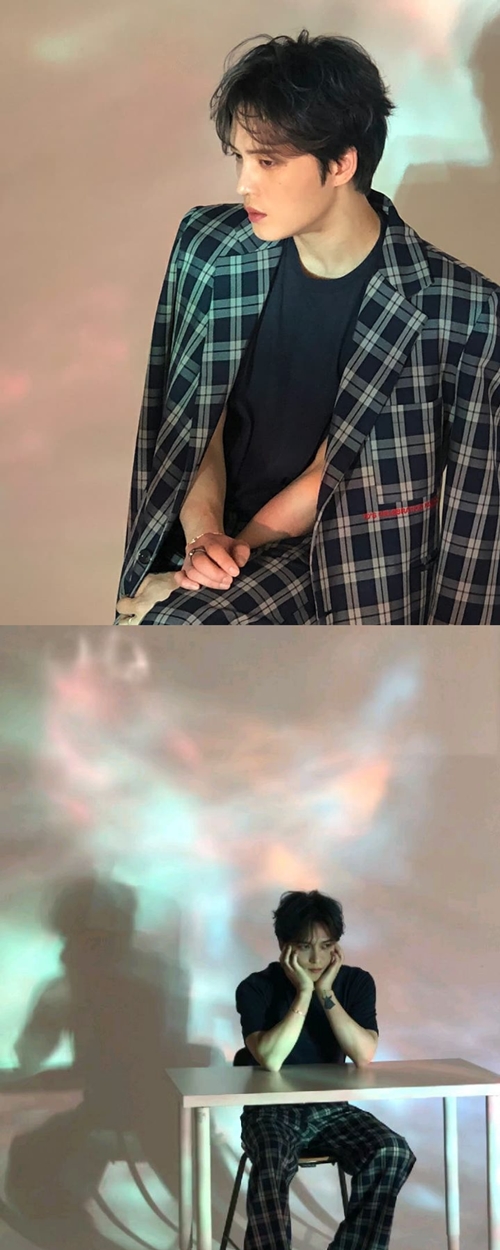 写真の中のジェジュンは、チェックのセットアップを着用して意味ありげな表情を浮かべている。薄暗い中に神秘的なライトが照らされ、端正な顔立ちが一層際立つ。
