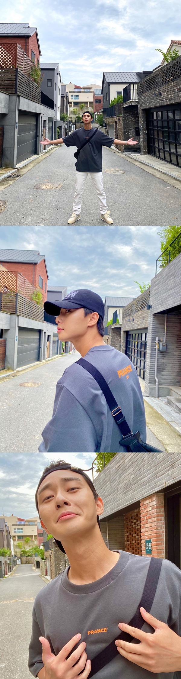 写真の中には、黒いTシャツに白いパンツを穿いたパク・ソジュンが、両腕を広げて道路に立っている。