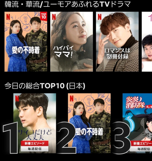 動画オンラインストリーミングサービスのNetflixによると、8月4日、日本の総合順位は1、2位がいずれも韓流コンテンツだ。1位はソ・イェジ、キム・スヒョン主演の『サイコだけど大丈夫』、2位はソン・イェジン、ヒョンビン主演の『愛の不時着』だった。